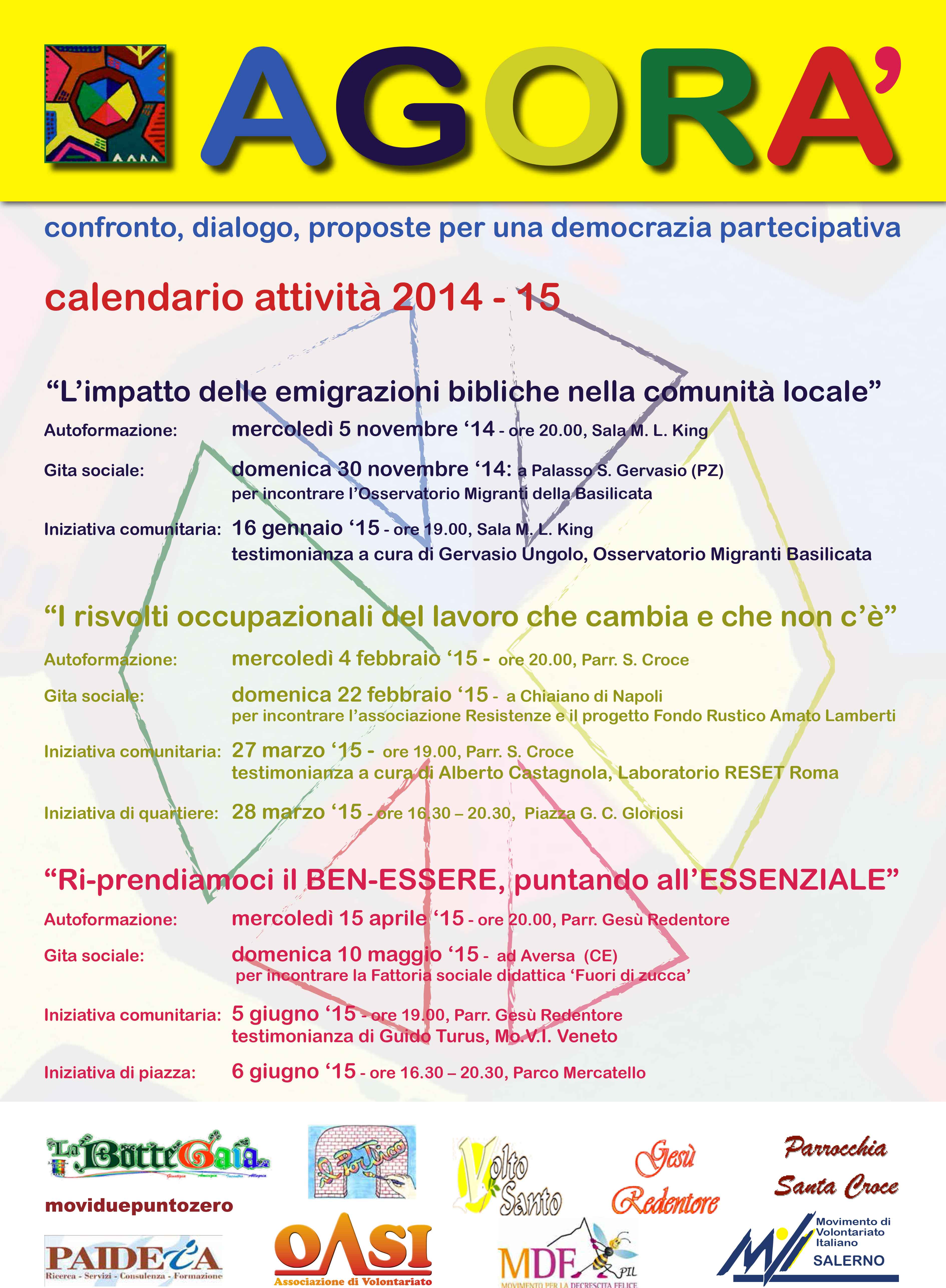 Ricco e interessante il calendario delle attività di Agorà, l’iniziativa di rete promossa anche dall’associazione Paideia di Salerno per il “confronto,dialogo, proposte per una democrazia partecipativa”. Per i prossimi appuntamenti (vedi la Locandina Locandina-Agorà-generale ) i temi sono “I risvolti occupazionali del lavoro che cambia e che non c’è” (tra febbraio e marzo, autoformazione, gita sociale e iniziative comunitarie e di quartiere); “Riprendiamoci il Ben-ESSERE, puntando all’Essenziale” (aprile-giugno): Le iniziative sono aperte